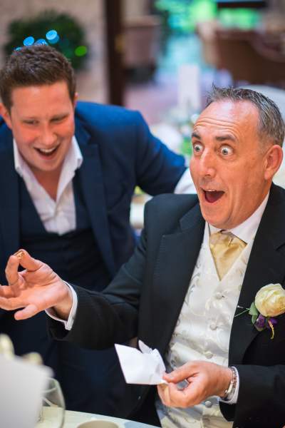 Most often, Mark is asked to perform as a table magician at weddings. He works at around 100 weddings per year, so knows exactly how to do it right. The most important thing about the wedding day is the bride and groom, and he knows this, so he won’t try to steal the limelight, but he will help to make it the most memorable day for the guests and the happy couple. Knowing that weddings rarely run to schedule, he can help to disguise any little hiccups that may occur and will use his experience to break the ice for guests who may not have met each other before, making the rest of the day a lot easier to handle for guests and the newlyweds alike.